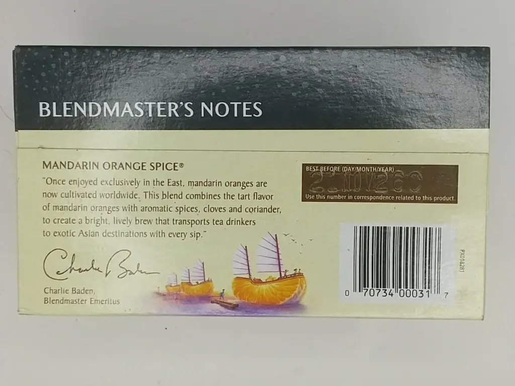 背面にはマンダリンオレンジスパイスの説明と、ブレンダーマスターである、チャーリー・ベイデン氏のサインが載っています。