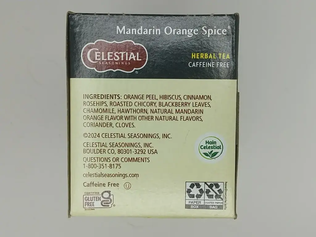 右側面にはマンダリンオレンジスパイスに使用されている素材一覧と、グルテンフリー・カフェインフリー・再生紙使用の表記があります。