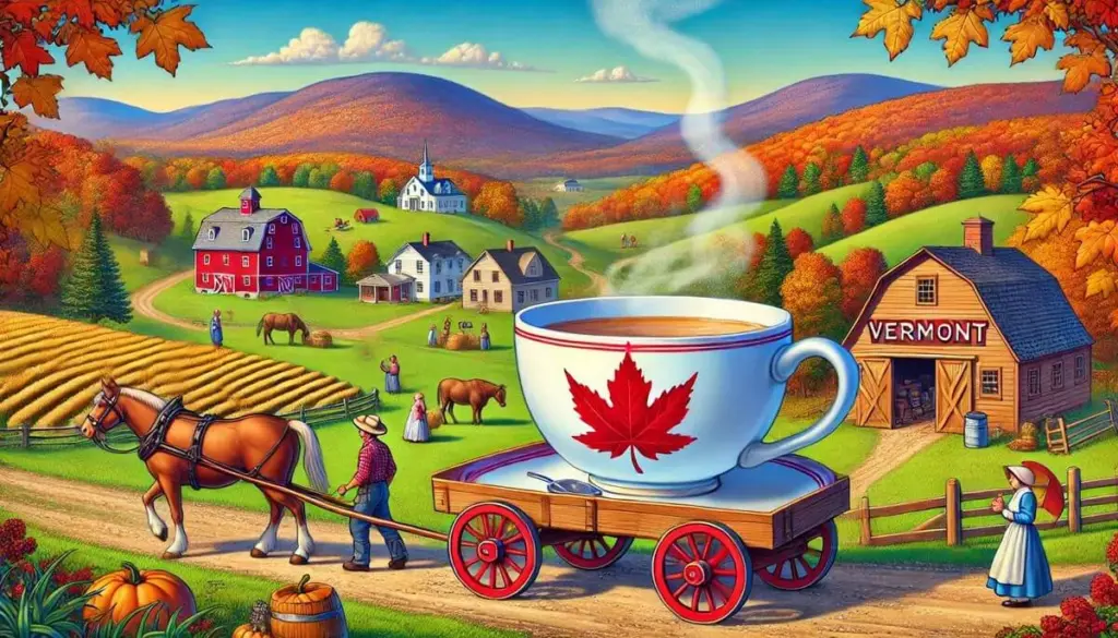 メイプルリーフマークが沢山入ったカップを荷車に乗せて引く馬、後ろにはティーポットの形をした家があります。
