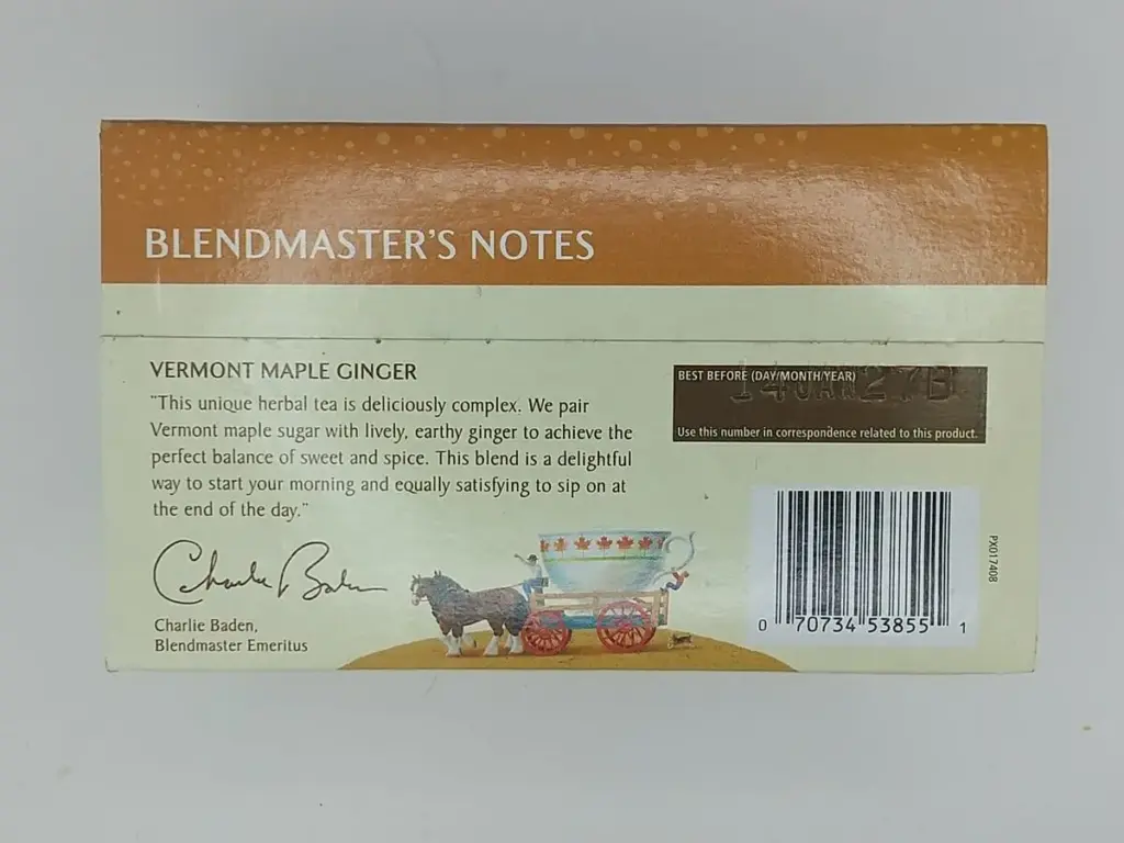 背面には、バーモントメイプルジンジャーの紹介、ブレンダーマスターであるチャーリー・ベイデン氏のサインが載っています。