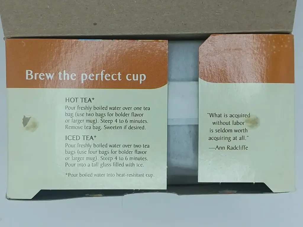 中のフタには、左にBrew the perfect cup(完璧な一杯を淹れる)、右にはアン・ラドクリフの名言が載っています。