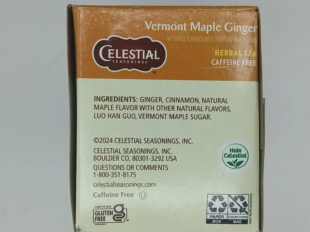 右側面には、バーモントメイプルジンジャーで使われている素材、グルテンフリー、カフェインフリー、再生紙使用のマークが載っています。