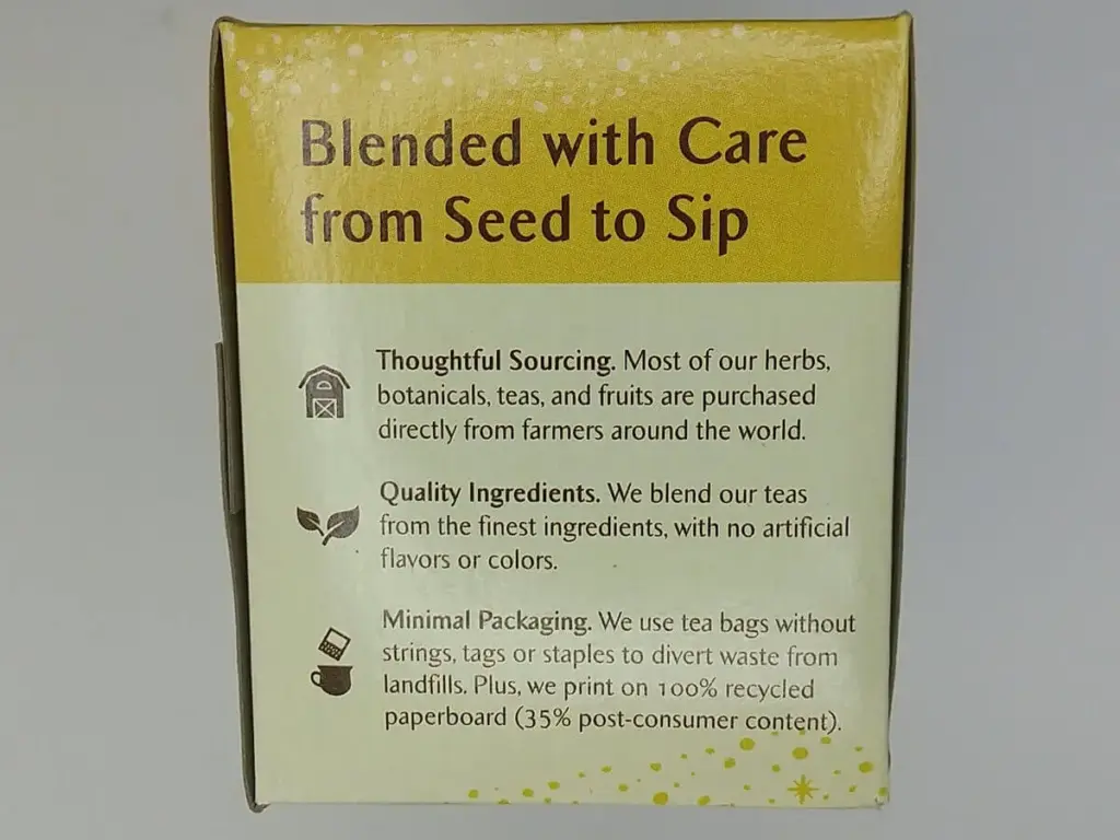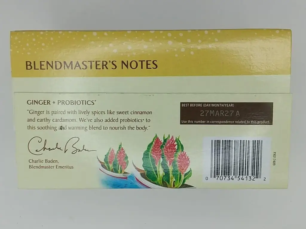 ジンジャープロバイオティクスの背面には、セレッシャルのブレンダーマスターであるチャーリー・ベイデン氏のサイン、そして商品の紹介文が書かれています。