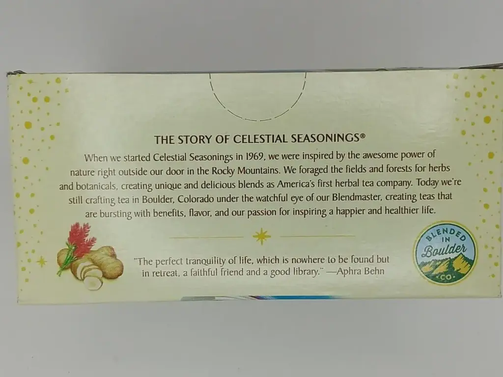 底の部分には、セレッシャルシーズニング社が設立されるまでのストーリー、下にはアフラ・ベーンの名言が書かれいます。