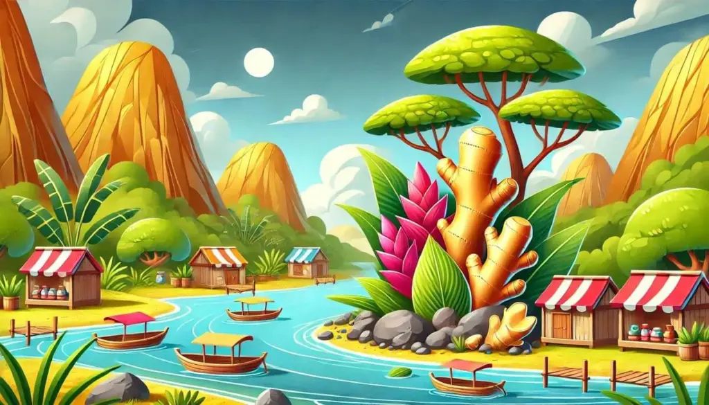 ジンジャープロバイオティクスのパッケージには、ショウガの山、船の乗ったショウガの花が描かれています。