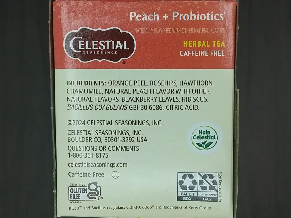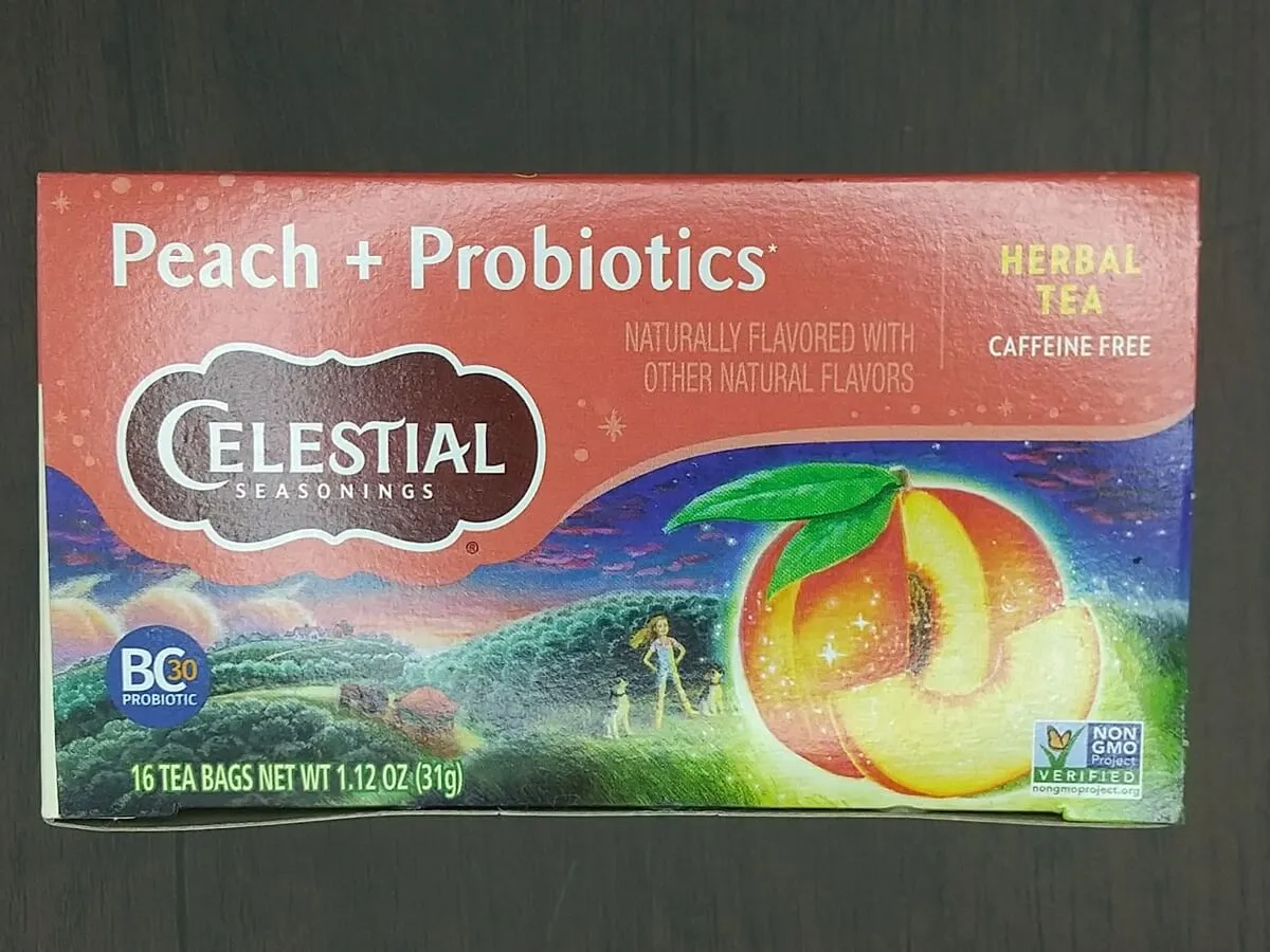 セレッシャルの「ピーチ+プロバイオティクス」は、フルーティーな香りと優しい味わいが特徴のノンカフェインハーブティーです。