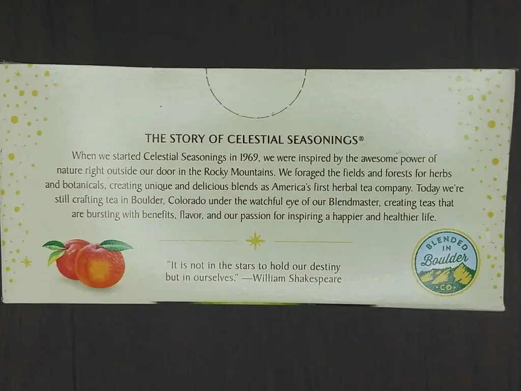 ピーチ+プロバイオティクスの底の部分には、セレッシャルシーズニング社が設立されるまでのストーリー、下にはウィリアム・シェイクスピアの名言が書かれいます。