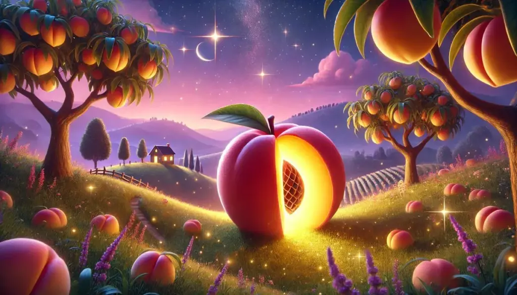 ピーチプロバイオティクスのパッケージには、夕暮れの丘、一部がカットされた光る桃が描かれています。